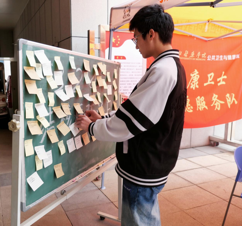 参加活动的同学们以“便签寄语”的方式书写着自己对于结核病预防及治疗的认识。志愿者用绘画的形式,以口罩为载体,在口罩上展示预防结核病小Tips。