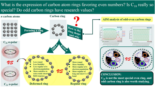 具体而言,该工作的一个亮点是首次提出通过拟合Cn(n=6-31)环原子坐标的椭圆形状来定义碳环的偏心率和原子占据率,从而可以对各奇数和偶数碳环的“圆形程度”进行比较。此外,对比奇数碳环和偶数碳环的研究包含了各尺寸碳环的态密度、理论计算电子吸收光谱、对静电场的极化响应、π电子布居以及成键临界点的拓扑特性等内容。结果表明,至少在理论上,C18碳环至少在结构上不是偶数碳环中最特殊的,C16和C24环呈现出更完美地正圆形状。而较大尺寸的奇数碳环比偶数碳环具有更好的光敏性,值得后续研究。具体的研究内容请参考在线文档https://www.sciencedirect.com/science/article/pii/S2211379723006459