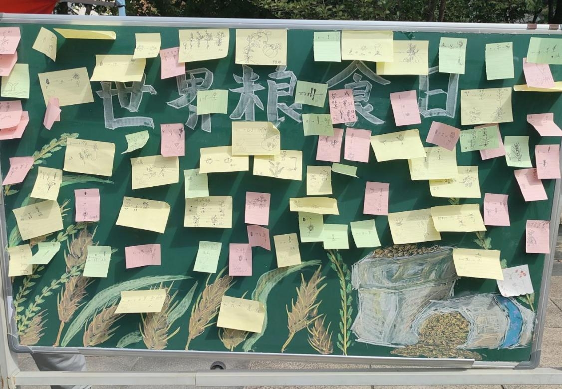 活动伊始,志愿者们向到场同学普及“世界粮食日”的背景,介绍此次活动的目的,以帮助同学们更好地理解“世界粮食日”的意义。此次活动还设置有一个小游戏,即将粮食种子的图片与成熟的粮食作物图片配对,配对成功则视为挑战成功。完成挑战之后,同学们将在便利贴上画出自己所熟悉作物的生长过程。活动最后,同学们将画好的作物生长过程统一贴在展板上。同学们在一张张便利贴中感受到粮食的可贵,将更好的了解和发扬节约粮食的传统美德。