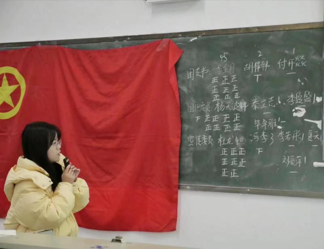 活动伊始,全体同学起立奏唱国歌。随后,团支委汇报了上一年的工作总结,宣读监票人、唱票人、计票人名单以及选举办法,并按照《中国共产主义青年团章程》、《中国共产主义青年团基层组织选举规则》等有关规定,以无记名投票方式选举新一届团支部委员。最终,季金月同学成功当选团支书,杨天波同学成功当选组织委员,杜龙同学成功当选宣传委员。