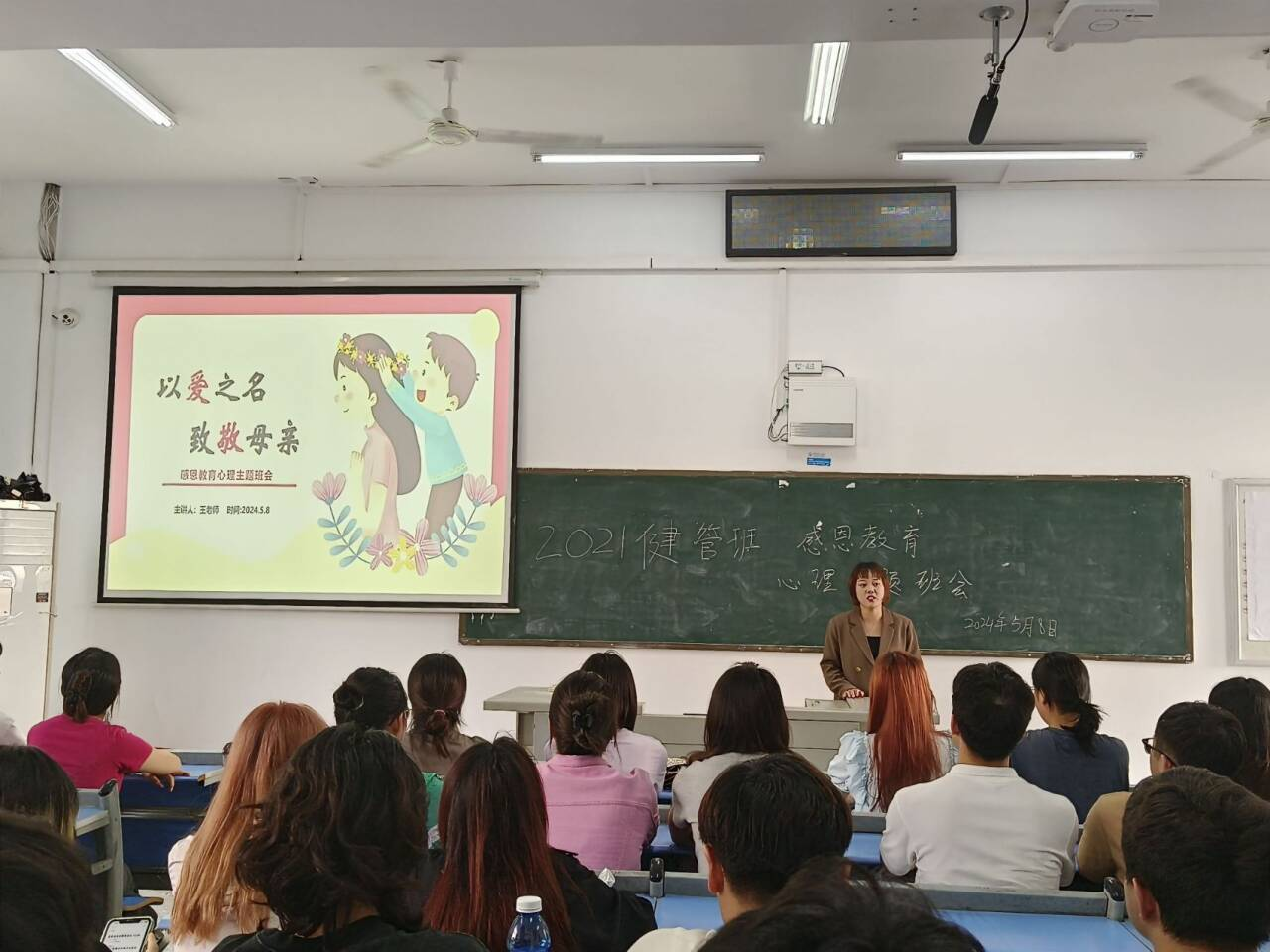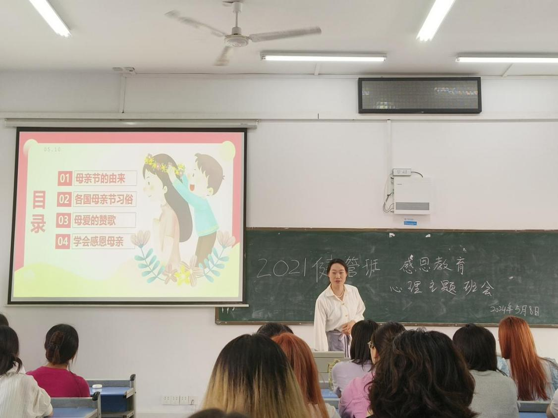 本网讯(通讯员 冯楠琦)为弘扬中华民族传统美德,培育和践行社会主义核心价值观,在母亲节来临之际,2021级健康服务与管理班级开展了“以爱之名,致敬母亲”的心理主题班会。本次班会由辅导员王晶艳主持、公司员工工作办公室副主任石中玉参加活动。