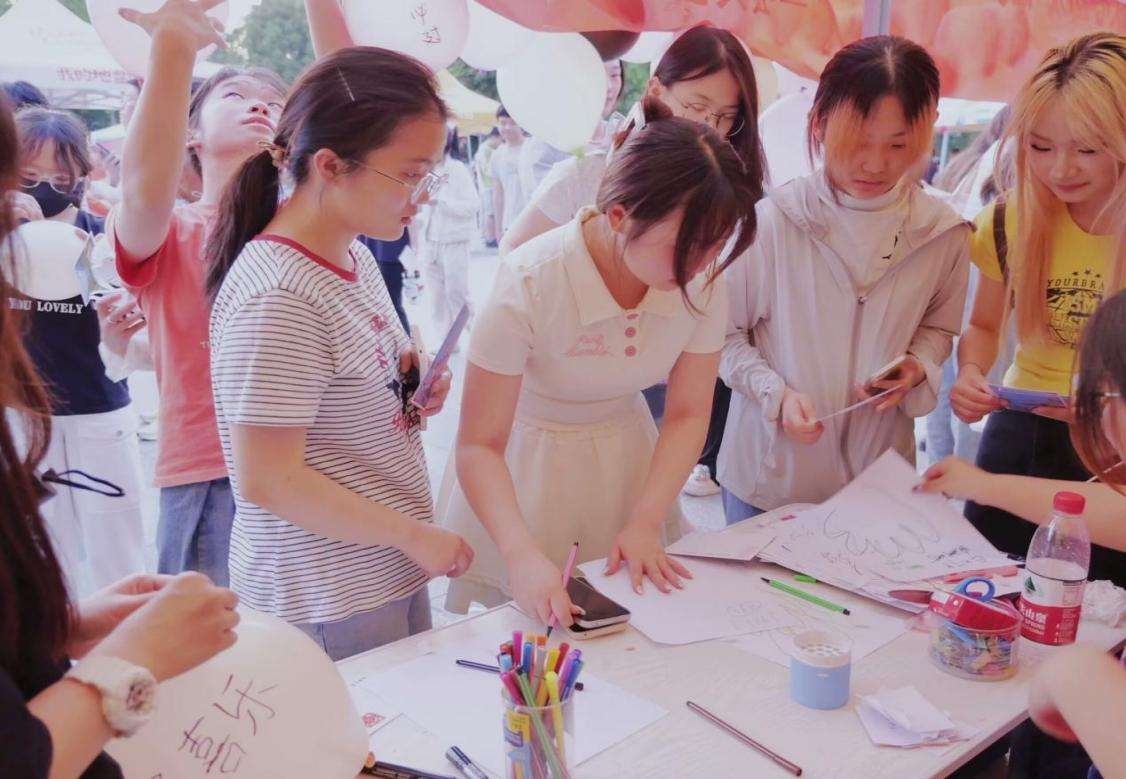 此次活动设置了“情绪释放球”、“心灵滋养站”和“梦想小邮差”三个互动游戏。在“情绪释放球”环节,同学们写下烦恼和情绪贴在乒乓球上投入烦恼消化箱里,在欢声笑语中释放情绪,舒缓压力;“心灵滋养站”游戏中,同学们勾勒出自己的手掌,留下生活感悟,增进了彼此之间的理解和尊重;最后,大家在“梦想小邮差”活动中,将温暖鼓励和梦想心愿写在气球上,或寄存在“梦想邮局”或与他人进行交换,在悦纳自己,温暖他人的同时,分享尊重信任、给予快乐友谊。