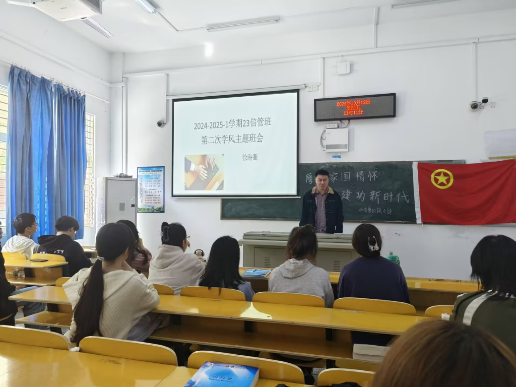本网讯(通讯员 徐海衢)为进一步巩固优良学风,激发学习热情,23级信管班于10月18日上午在5114教室开展学风建设主题班会,本次大会由23级信管班班主任徐海衢老师主持,23级信管班全体员工参加。